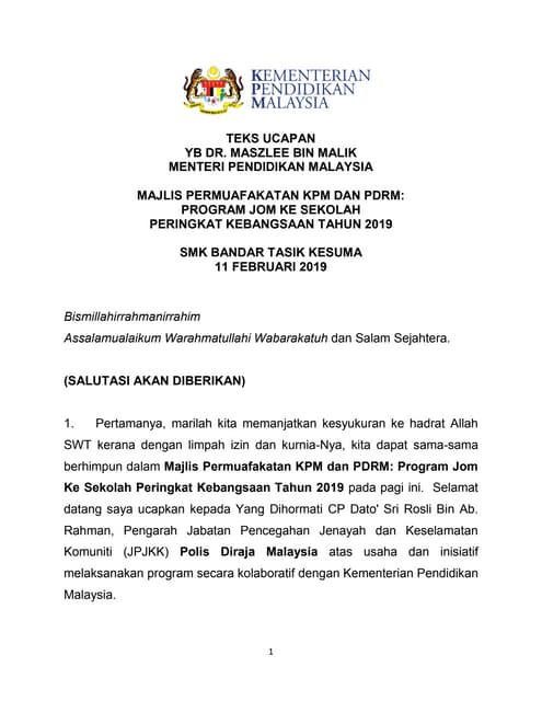 Kpm Siaran Media Majlis Permuafakatan Kpm Dan Pdrm Program Jom Ke Sekolah Peringkat Kebangsaan Tahun 2019
